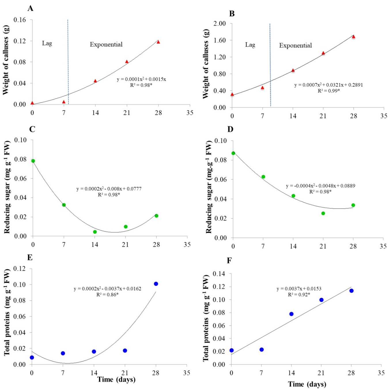 Some authors have demonstrated that the period of the lag phase varies according to the species studied (Abbas et al., 2018) and type of explant considered (Feitosa et al., 2013). Our results agree with those reported for other plant species, such as the pequi tree (Caryocar brasiliense Camb), in which the lag phase of the callus growth curve happened until the 7th day of cultivation (Landa, Paiva, Paiva, Bueno Filho, 2000).