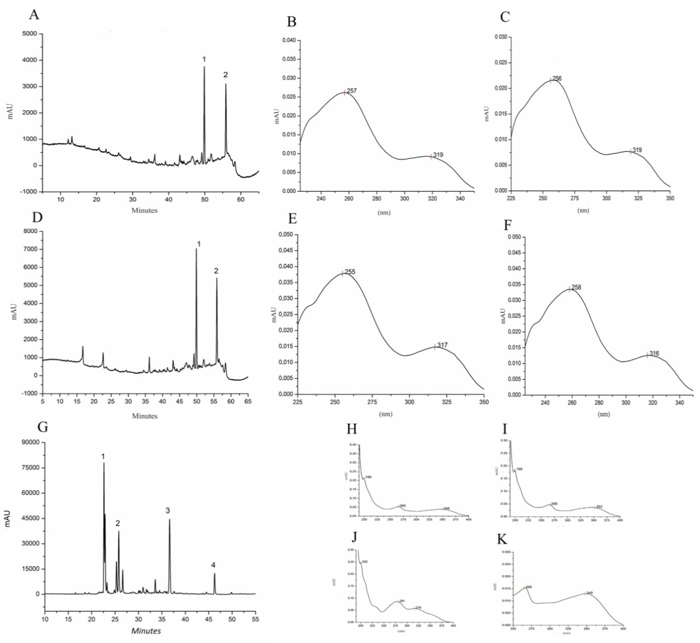 In our study, it was possible observed different chromatographic profiles between the extracts evaluated via high-performance liquid chromatography (HPLC) (Figure 4). The chromatogram of the extracts from the calluses obtained from the cotyledon (Figure 4a~c) and leaf segments (Figure 4d-f), showing a highly intense peak at retention time near 50 minutes, while in the extract from the aerial parts exhibited a more complex chromatographic profile and the retention time of this peak was shorter, near 23 minutes (Figure 4c). These results to indicate that the extract from the plants growth in vivo have more substances than extracts from the calluses grown in vitro.