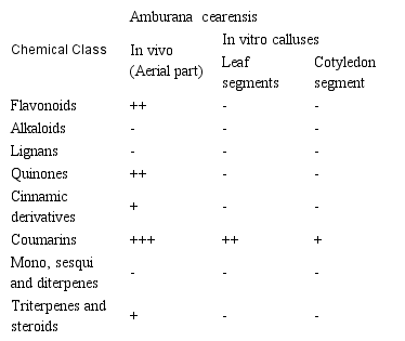 The results of the phytochemical analysis identified the presence of coumarin in all the extracts evaluated, which can be very useful to the pharmaceutical industry, since this secondary metabolite has high pharmacological potential. However, it is necessary to evaluate the growth for a longer period so as to analyze other phases of the growth curve of A. ceaerensis calluses and establish the best moment for subculture. Considering the large scale production of cells is a mandatory step to set up economically viable in vitro production of pharmacological compounds, additional studies starting from leaf and cotyledon segments explant of A. cearensis calluses, should also be conducted via bioreactor systems.