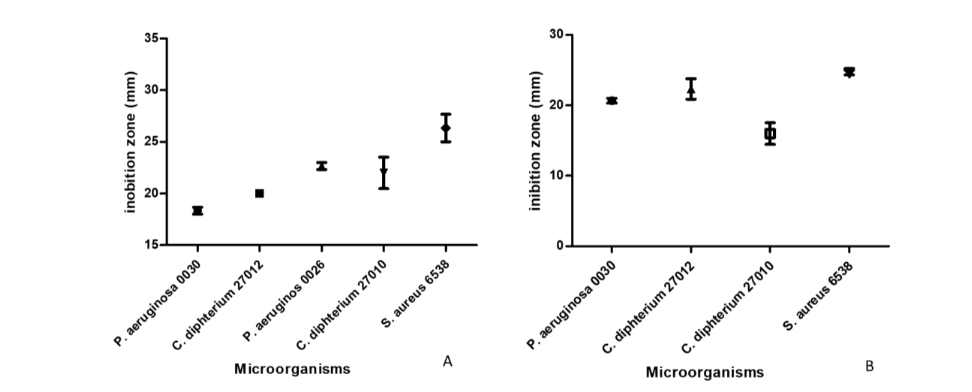 The bacteria Staphylococcus aureus ATCC 6538, Pseudomonas aeruginosa ATCC 0030, Pseudomonas aeruginosa ATCC 0026, Corynebacterium diphtheria ATCC 27012, and Corynebacterium diphtheria ATCC 27010 were grown on Mueller Hinton agar plates for 24 hours at 37°C, and then diluted with 0.9% saline according to standard turbidity of 0.5 McFarland tube (108 CFU mL-1).