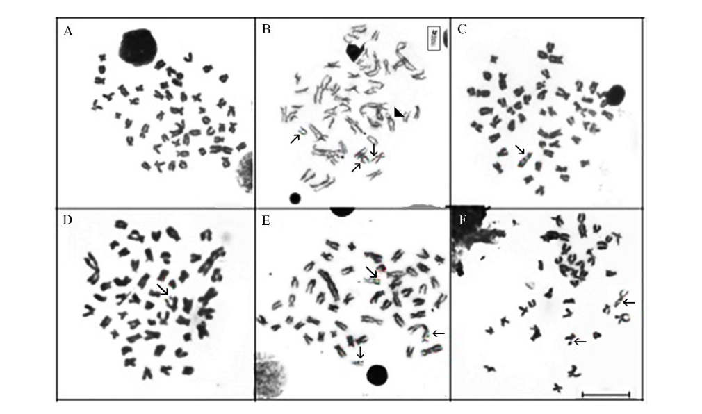 The fish exposed to the herbicide Dormex® presented chromosomal aberrations (CAs) at all concentrations tested. A total of 240 metaphases (60 metaphases per group, including the control) were obtained from the A. lacustris specimens. In the control group, the majority of metaphases (2n = 50) had no changes in their chromosome structure (Figure 1A). In the herbicide treatment groups, the number of metaphases with CA (a total of 12) did not vary significantly among treatments or exposure times, with five being recorded at a concentration of 0.05, three at 0.01, and four at 0.5 mL L-1. Despite the low Dormex® concentrations applied in the present study, the presence of chromosomal aberrations in all three groups indicates the toxic effects of this compound on the fish. In addition, some metaphases presented more than one chromosome with aberrations (Figure 1B-F).