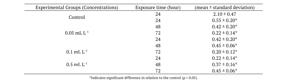 The mitotic index (MI) of the kidney cells varied significantly (p < 0.05) among Dormex® concentrations and exposure times (Table 1, Figure 2), with a reduction in the number of kidney cells in mitosis in comparison with the control group (2.10 to 0.47). These results indicate that Dormex® may interfere with cell division in the cells of A. lacustris. There was also a significant reduction in MI as exposure time increased in the 0.05 and 0.1 mL L-1 groups. At the higher concentration (0.5 mL L-1), however, an inverse relationship was found with exposure times, which may reflect a reduction in the concentration of the cyanamide in the water over time, which may have allowed for the recovery of the animals, or alternatively, an increase in the effectiveness of DNA repair mechanisms over time. Understanding the DNA repair mechanisms in a target species is of fundamental importance, given that this is the main line of defense of an organism against genotoxic agents (Kienzler, Bony, & Devaux, 2013). Srivastava and Singh (2013), found that the mitotic index was significantly (p < 0.05) reduced in the kidney tissue of specimens of the walking catfish, Clarius batrachus (Linnaeus, 1758), exposed to sub-lethal doses of carbamate fungicide (11.43 and 22.87 mg L-1), after 24, 48, 72 and 96 hours.