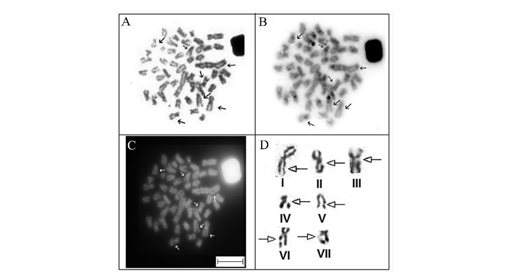 The cytotoxicity of Dormex® in the kidney cells of A. lacustris was also assessed by chromosomal banding (Ag-NORs, DAPI staining, and C-banding), to detect specific regions corresponding to aberrations. Staining with silver nitrate (Ag-NOR) identified a homologous pair of nucleolar, which had a decondensed region (secondary constriction) in the short arm of a subtelocentric chromosome (Figure 1B, arrowhead). The C-banding revealed a few heterochromatic blocks, distributed in the pericentromeric and telomeric regions of some chromosomes, including the nucleolar pair. However, most of the alterations involved the long arms of the metacentric, submetacentric, and acrocentric chromosomes (Figure 3D), and did not coincide with the heterochromatic blocks. The chromatid breaks shown in Figure 3A were negative for DAPI staining, which indicates a lack of AT repeats (Figure 3C). The distribution of inter- and intra-chromosomal breakpoints does not appear to be random, and breaks tend to occur preferentially in active regions of the chromatin (Obe et al., 2002), as shown in the present study, where the break points do not coincide with heterochromatic regions. However, this pattern requires confirmation through a larger sample of C-banded metaphases in exposed specimens.