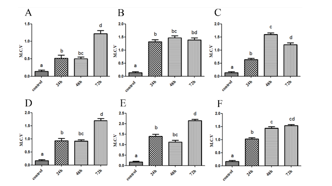 Morphological damage to fish gills, such as epithelial hyperplasia, lamellar fusion and epithelial elevation, after exposure to pesticides, act as defense mechanisms, and generally cause a decrease in the respiratory surface, thereby inhibiting pesticide absorption and increasing the pesticide-blood diffusion distance (Velmurugan et al., 2020). The decrease in the surface area available for respiration also results in a loss of osmoregulatory mechanisms (Nogueira, Castro, Vieira, & Rigolin-Sá, 2011), and may ultimately result in death from anoxia (Rand & Petrocelli, 1985). This defense mechanism was probably triggered in the A. lacustris individuals in response to exposure to the Dormex®. The analysis of the mean changes values (M.C.Vs) also indicates a gradual increase in the severity of the lesions (hyperplasia and lamellar fusion) in the A. lacustris specimens over time and among the different concentrations (Figure 5). However, animals exposed to Dormex® over 72 hours did not survive, due to the anoxic mechanism.