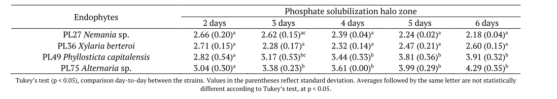 In the present study, all strains of endophytic fungi showed phosphate solubilization activity. Pande et al. (2017) evaluated the solubilization of phosphate by endophytic bacteria and described high solubilization activities, ranging from 4.48 to 4,88 during seven days of incubation. This was similar to the results found herein, where Alternaria sp. PL75 exhibited a phosphate solubilization value of 4.29 on the sixth day, suggesting strong activity.
