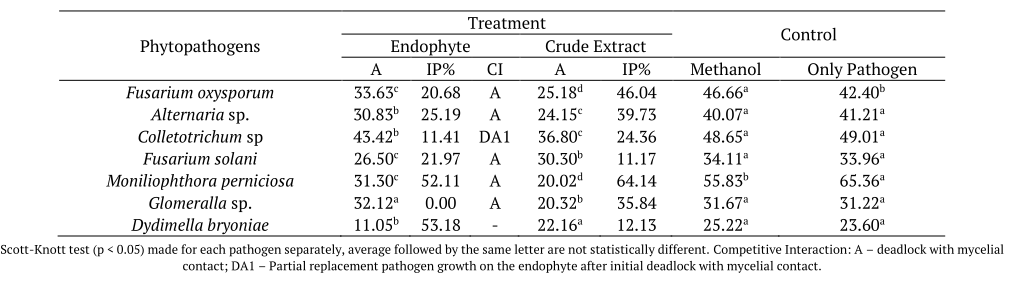Metabolic extraction from the fermented culture and in vitro antagonism assays were carried out following the protocol described by Polonio et al. (2015). For the agar diffusion test, Potato Dextrose Agar plates received 5 mm autoclaved filter paper plugs inoculated with 10 μL of metabolites (70 mg mL-1) in the opposite position of phytopathogens plugs (6 mm diameter), and were incubated at 28ºC for seven days. For the negative control, the paper plugs received 10 μL of methanol. Competitive interactions between endophytes and phytopathogens were determined according to the rating scale proposed by Ribeiro et al. (2018).