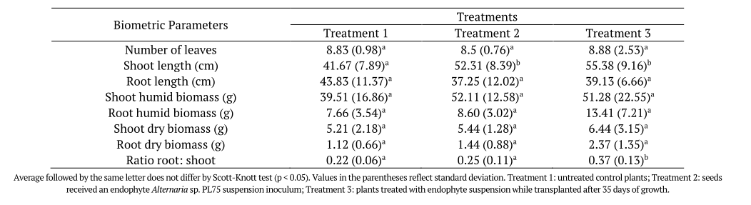 Besides, it was observed that inoculating tomato seeds with Alternaria sp. PL75 increased the percentage of germination. Similar results were obtained by Nandhini et al. (2018), in which millet plants had their germination and growth augmented by endophytes that produce IAA.
