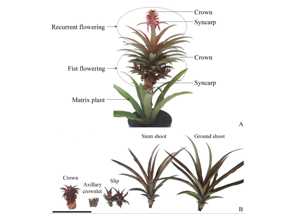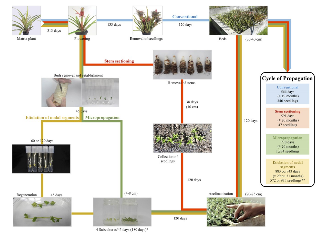 Pineapple plants are generally propagated vegetatively by means of plantlets (Jiménez, Sanewski, Reinhart, & Bartholomew, 2018). Besides the risk of disseminating pests and diseases, propagation of pineapple plants by the conventional method is slow and uneven, requiring a long period for establishment of a new planting area (Souza et al., 2013).
