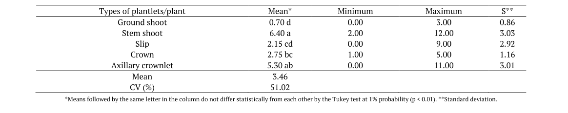 Evaluation of the propagation potential of the ORN-MUT hybrid by the conventional method was important to learn the capacity for tillering and production of plantlets of this ornamental variety, aiming to select the most developed, vigorous and healthy individuals for planting in the field. In general, the slip plantlets are chosen most often because they are easy to collect, usually have good vigor and intermediate culture cycle between crown and ground shoot plantlets. The ground shoot plantlets, although having greater development, shorter production cycle and earlier natural flowering, have low yield and are difficult to remove from the plant, besides having non-uniform size and weight. The stem shoot plantlets have low yield and are not often used for commercial cultivation. Those from the crown, in turn, have more uniform size and weight but less vigor and a longer planting-collection cycle, only being used in regions where the fruit is processed industrially (Jiménez et al., 2018).