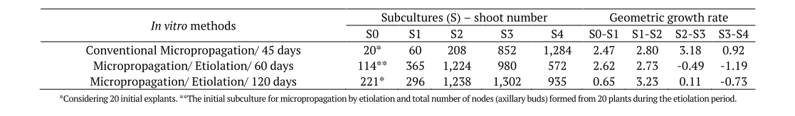 The propagative potential of the in vitro methods was measured by calculating the geometric growth rate (TCG) between two successive subcultures and between the first and last subculture, according to the method described by Silva et al. (2016). The design was completely randomized with 20 replicates per treatment.