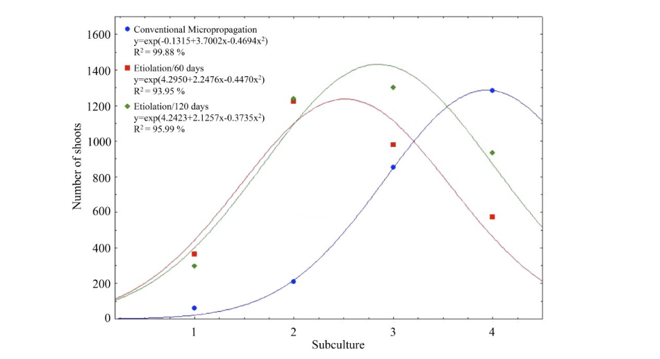 The peak production after 60 days of etiolation occurred after the second subculture, obtaining 1,224 plants (Table 2). There was a significant decline in the number of plants obtained at the end of the four subcultures, mainly between the third and fourth (Table 2).