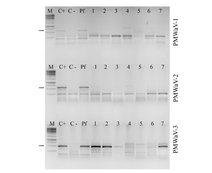 Reverse transcription (RT) consists of two consecutive steps. The first involves synthesis of complementary DNA (cDNA). For this purpose, 1.0 µL of dNTP 10 mmoL L-1, 1.0 µL of the primer random hexamer 6 bp, 1.0 µL of primer PMWaV-1 R, 1.0 µL of primer PMWaV-2 R, 1.0 µL of primer PMWaV-3 R, 4.0 µL template RNA and 1.0 µL of sterile deionized water were placed in 50 µL PCR microtubes. The mixture was incubated at 70ºC for 10 min. in a thermocycler, followed by 4ºC for 2 min. Then 2.0 µL of M-MLV 10x buffer, 0.5 µL of RNAse Out®, 6.5 µL of sterile deionized water and 1.0 µL of the enzyme M-MLV reverse transcriptase were added, obtaining a total reaction volume of 20 µL. The final mixture was incubated at 37ºC for 50 min. in the thermocycler, followed by 10 min. at 80ºC to inactivate the enzyme. In the s step, 3.0 µL of the recently synthesized cDNA, 1.0 µL of primer F 10 nmoL, 1.0 µL of primer R 10 nmoL, 1.0 µL of dNTP 2.5 mmoL L-1, 2.5 µL of Taq DNA polymerase PCR buffer (10x), 1.5 µL of MgCl2 50 mmoL L-1, 14.8 µL of sterile deionized water and 0.2 µL of Taq polymerase 5 U µL-1 were placed in microtubes, obtaining a reaction volume of 25 µL.