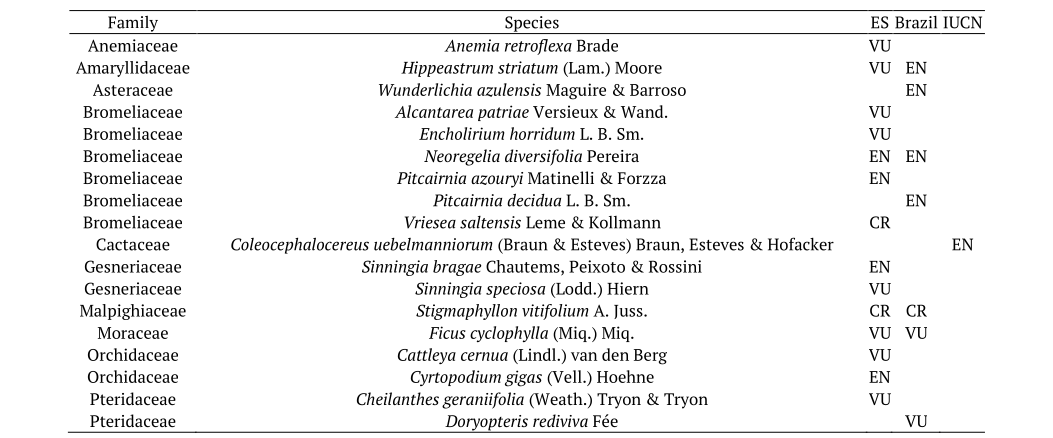 Species were classified according to vegetative habit as trees, shrubs, subshrubs, climbing plants and herbaceous, following Couto et al. (2017). The endangered species were cited according to the official list of Centro Nacional de Conservação da Flora (cncflora.jbrj.gov.br), Red List of Espírito Santo state (Fraga, Peixoto, & Leite, 2019) and IUCN Red List (https://www.iucnredlist.org/).