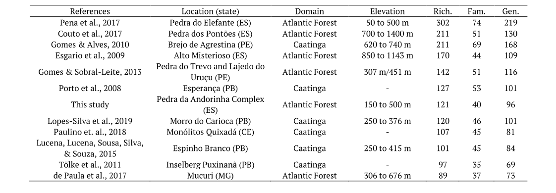 The survey results differ from some other studies conducted previously in various regions of Brazil (Table 2). In general, the number of species was higher, especially in comparison to inselbergs in the Caatinga Domain, but it was lower compared to inselbergs of the Atlantic Forest, with rare exceptions. These variations can be explained, according to Porembski (2007), by the clear pattern of distinction between different geographic regions, in which environmental filtering differentially shapes inselberg species composition and structure (Yates et al., 2019).