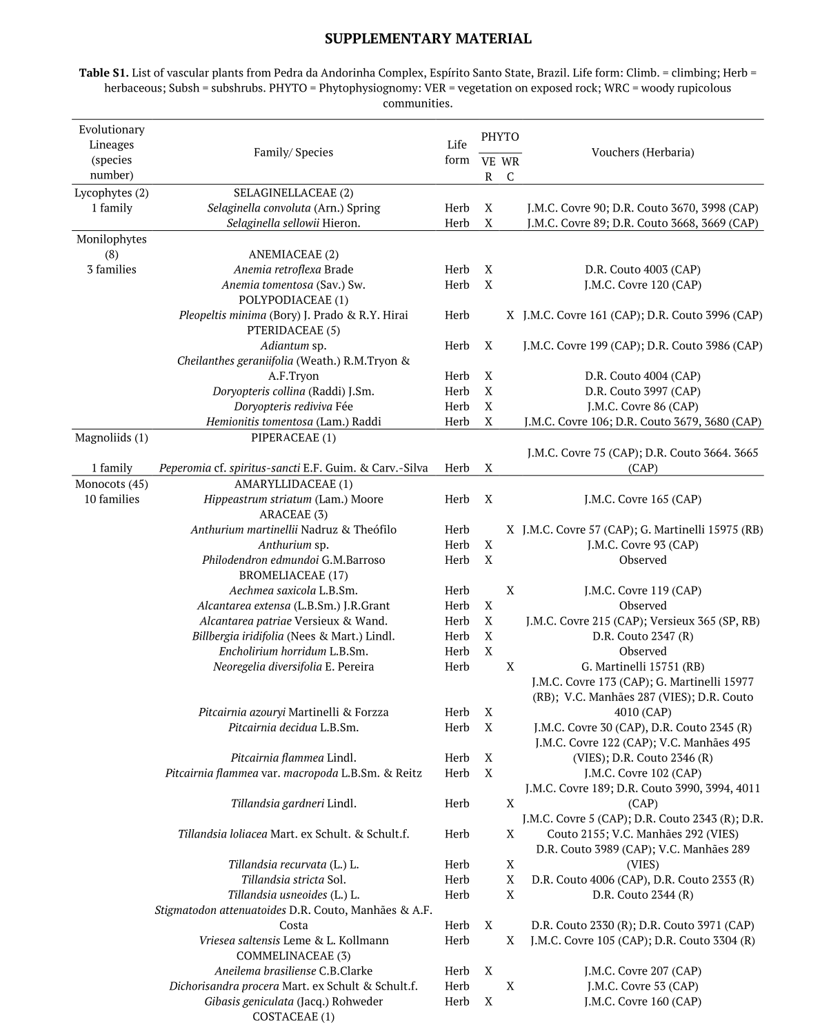 In general, the rocky outcrops of the PAC can be organized into two main phytophysiognomies: (i) vegetation on exposed rock and (ii) woody rupicolous communities. All species were organized according to their occupation within these two rocky phytophysiognomies.