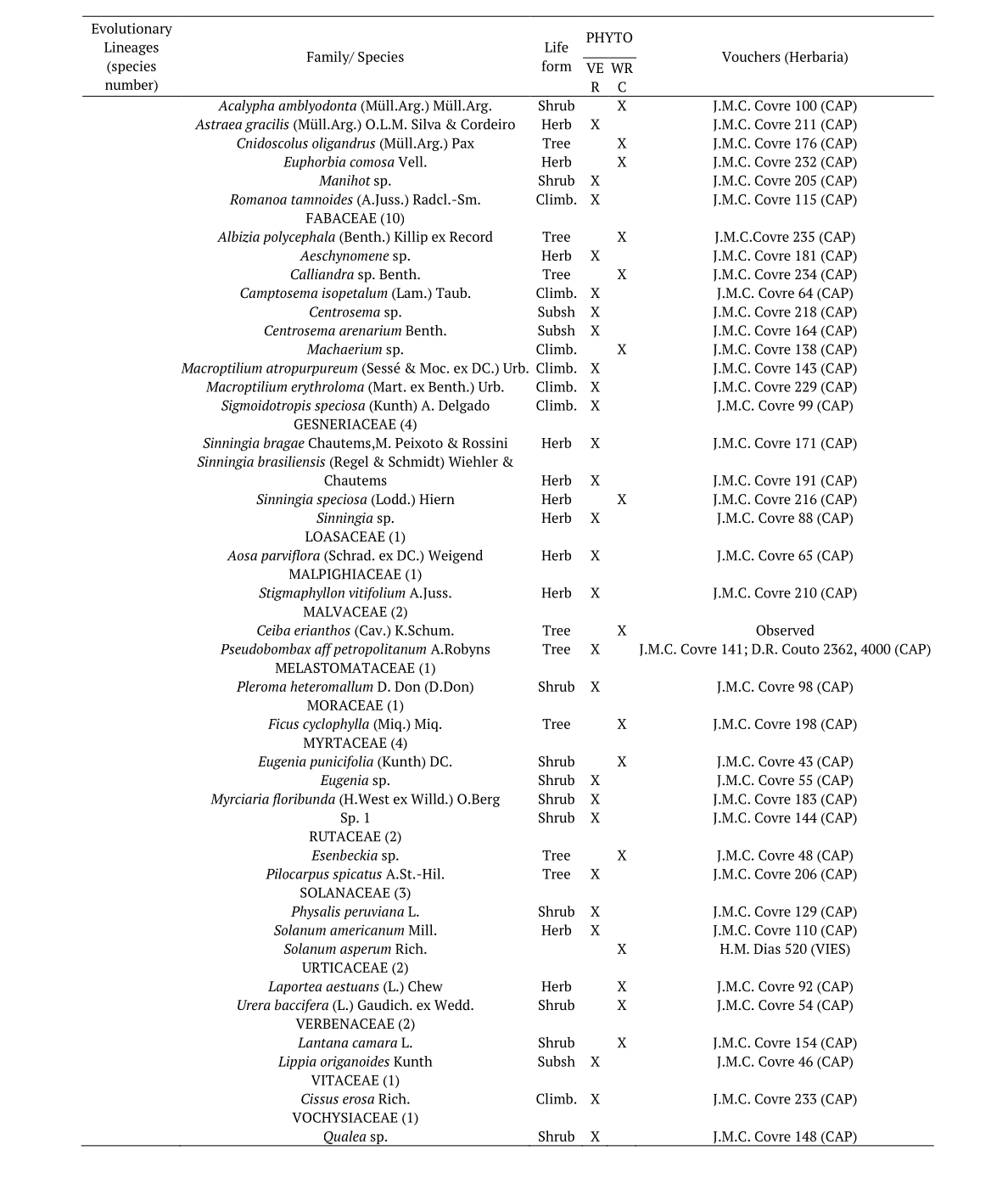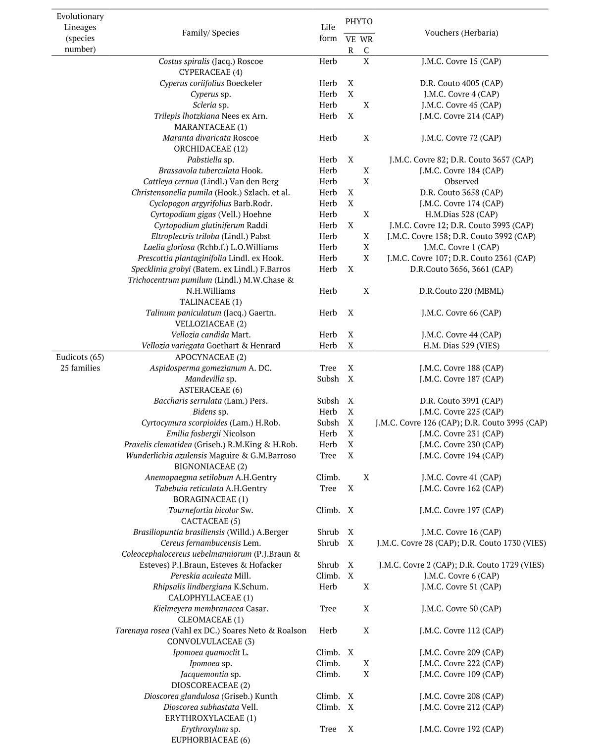 Collections of botanical material were carried out for all species recorded in the study and voucher specimens were deposited in the CAP herbarium (acronym according to Thiers – continuously updated), of the Universidade Federal do Espírito Santo, in Jerônimo Monteiro, state Espírito Santo.