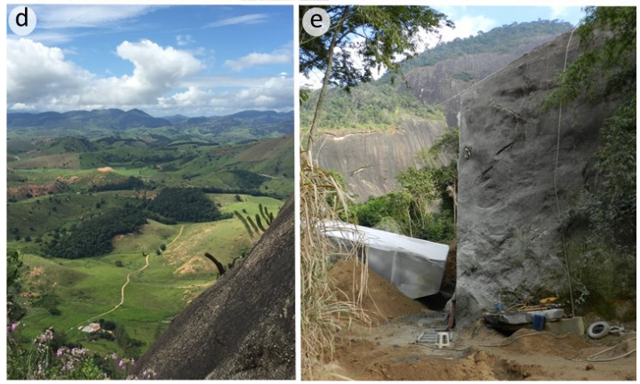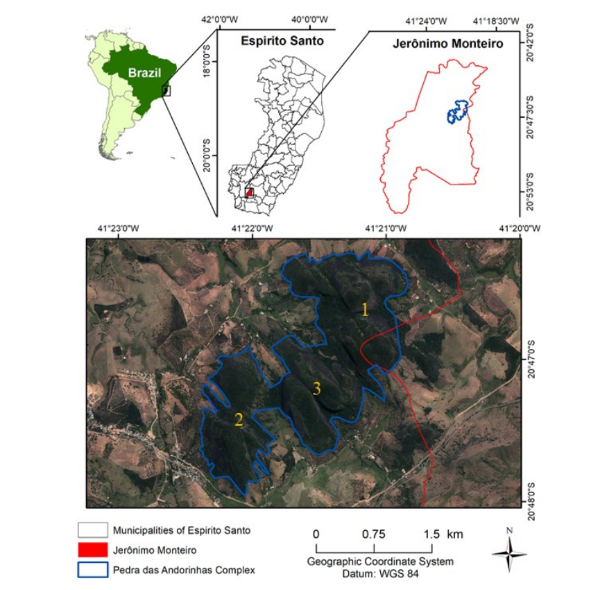 According to reports from local residents, the PAC has a history of bushfires (between 15 and 20 years ago) and some mineral exploration. The rocky complex consists of several inselbergs, which are generally difficult to access (Figure2). In this study, we investigated three rock outcrops, one between Cachoeiro de Itapemirim/ Jerônimo Monteiro, known as Pedra das Andorinhas (1) (20° 46’ 19” S; 41° 21’ 12” W), and two others in Jerônimo Monteiro: Parada Cristal (2) (20° 47’ 39” S; 41° 22’ 20” W), Pedra Três Irmãs (3) (20° 46’ 19” S; 41° 21’ 12” W).