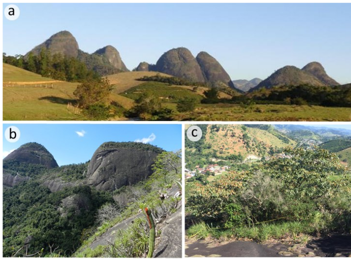 In Atlantic Forest of southeastern Brazil occurs a special class of residual landforms, composed predominantly by plutonic (granite) and metamorphic (gneiss) rocks, that are ecologically known as inselbergs (from German, insel = island, berg = mountain). They can occur isolated or in groups, separated by a few or many kilometers, forming inselberg landscapes (Hmeljevski, Nazareno, Bueno, Reis, & Forzza, 2017). These ecosystems differ greatly from the surrounding matrix, having unique edaphic-climatic characteristics that select for a specialized vegetation with high endemicity (see Safford & Martinelli, 2000;Porembski & Barthlott, 2000; Porembski, 2007;de Paula, Forzza, Neri, Bueno, & Porembski, 2016). However, inselberg flora is frequently overlooked in favor of other ecosystems of the Atlantic domain.