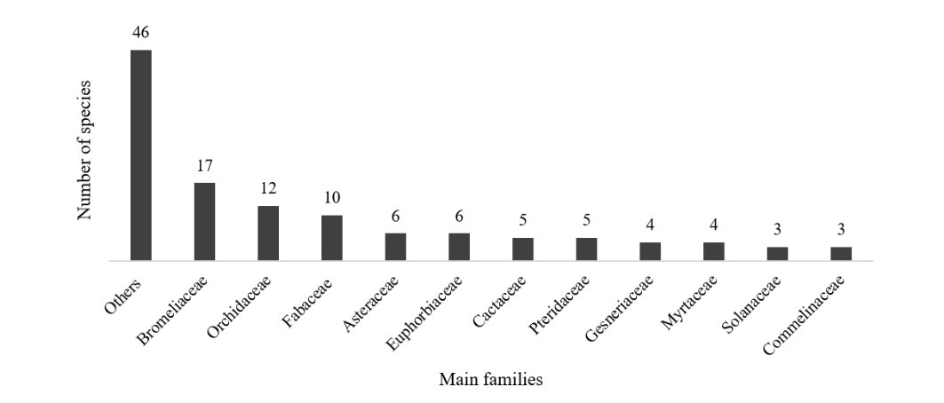 The richest families in the PAC were Bromeliaceae (17 spp.), Orchidaceae (12), Fabaceae (10), Asteraceae and Euphorbiaceae (6 spp. each), Cactaceae and Pteridaceae (5 spp. each), Gesneriaceae and Myrtaceae (4 spp. each), Solanaceae and Commelinaceae (3 spp. Each) (Figure 3). These families accounted for 75 species (i.e. 62% of the total) (Table S1).