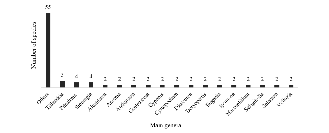 The genera represented by the most species were Tillandsia (Bromeliaceae), with five species, Pitcairnia (Bromeliaceae) and Sinningia (Gesneriaceae), both with four species each. Selaginella (Selaginellaceae), Doryopteris (Pteridaceae), Cyrtopodium (Orchidaceae), Eugenia (Myrtaceae), Centrosema, Macroptilium (Fabaceae), Cyperus (Cyperaceae), Alcantarea (Bromeliaceae), Anthurium (Araceae), Anemia (Anemiaceae), Ipomoea (Convolvulaceae), Dioscorea (Dioscoreaceae), Vellozia (Velloziaceae) and Solanum (Solanaceae) were represented by two species each (Figure 4).