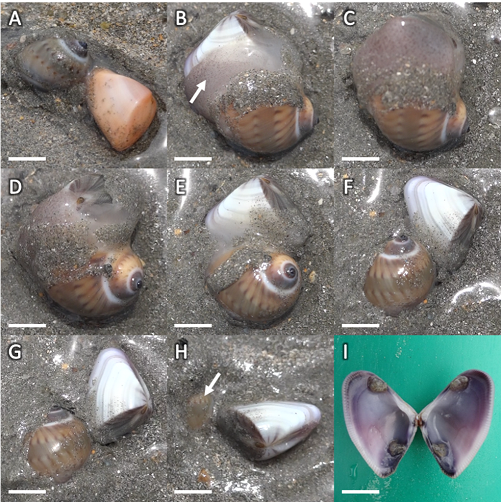 Figure 1. Sequence of images showing the predation of the gastropod Natica marochiensis on the bivalve Donax striatus in the intertidal zone of the beach of Camocim, where the naticid gastropod consumed the bivalve through the attachment of the radula to the soft body of the prey (A). Natica marochiensis carries the prey to a location where predation begins due to engulfing with the mantle (indicated by the arrow) which is able to encompass the entire bivalve (B, C, D and E). Due to the failure of the attack on the substrate, the gastropod buries itself (indicated by the arrow) a few centimeters into the sand where predation commences (F, G and H). Evidence of death due without perforations in the shell as well as the presence of traces of adductor muscles (indicated by the arrow) is observed (I). Scale: 6 mm (B, C, D, E and I), 7 mm (F, G and H) and 8 mm (A).