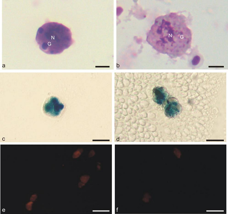 The morphological characterization of the liver and spleen melanomacrophages were performed using three methods: I) inverted microscopy observing the melanomacrophage adherence and morphology in plate; II) the melanomacrophage culture was analyzed in plate at fluorescence microscope for observation of the autofluoresce from melanomacrophages, and III) the melanomacrophages were cultured in glass histological coverslips in the bottom of the wells. Thus, the melanomacrophages adhered to coverlips permitted the cellular stained and morphology identification. Thus, the melanomacrophages were stained by Giemsa for morphological characterization and Perls’ assay was used to identify melanin, hemossiderin and lipofuscin pigments present in this cellular types.