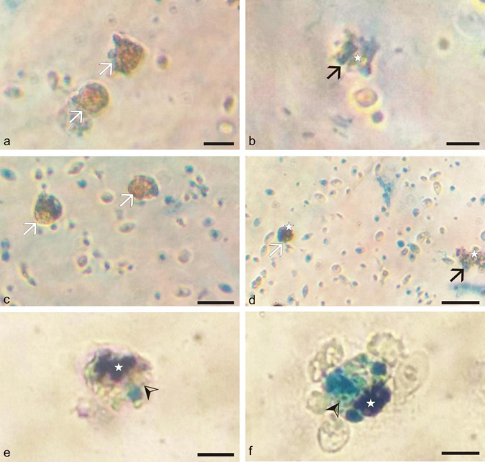 A hallmark of macrophages is the high phagocytic activity of substances foreign to the organism (Steinel & Bolnick, 2017). Phagocytic activity can be observed in light and electron microscopy in the macrophages (Luna et al., 2016; Qiu et al., 2016) Thus, from the coverslips stained with the Perl’s assay it was possible to observe that the cytoplasm of the liver and spleen melanomacrophages had black inclusions which might be MWCNTs endocytosed by these cells (Figure 3). Phagocytic activity after exposition to nanocomposites were recorded in rat macrophages and murine macrophages (tumoral lineage J774) and black inclusions were also observed in the cytoplasm of the these cells (Murphy et al., 2012; Luna et al., 2016). Probably MMCs from distinct organ can present different functions, where MMCs from liver could be associated to general metabolism, while MMCs from spleen could be related with inflammatory process (Vigliano, Bermúdez, Quiroga, & Nieto, 2006; Ribeiro et al., 2011). However, the real function of different types of macrophages from MMC still promotes great discussion and remains controversial.