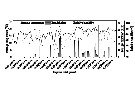 The experiment was conducted at the Universidade Estadual do Centro-Oeste (UNICENTRO), Cedeteg campus, in Guarapuava, state of Paraná (25°23'06" S; 51°29'31" W; 1.028 m altitude), from July to November 2018. The soil is oxisol with a clayey texture (Bognola, Fasolo, Potter, Carvalho, & Bhering, 2002). The predominant climate in the region is humid, without a dry season and with frequent frosts, classified by Köppen-Geiger as Cfb. During the experimental period, data on average temperature, relative humidity and total rainfall were collected at the meteorological station, located 120 m from the experiment (Figure 1).