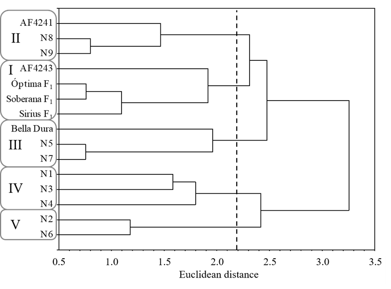 The cluster analysis of the 15 genotypes resulted in the formation of 5 distinct groups. The AF4243 genotype and the commercial cultivars Sirius F1, Optima F1 and Soberana F1 belong to group I. This group had the largest number of leaves, reaching 9 leaves per plant and highest values for the pseudostem diameter, from 18.0 to 20.4 mm. Values of height, total productivity and bulb mass were intermediate, not exceeding 66.5 cm, 37.3 t ha-1 and 82.5 g bulb-1, respectively (Figure 2).