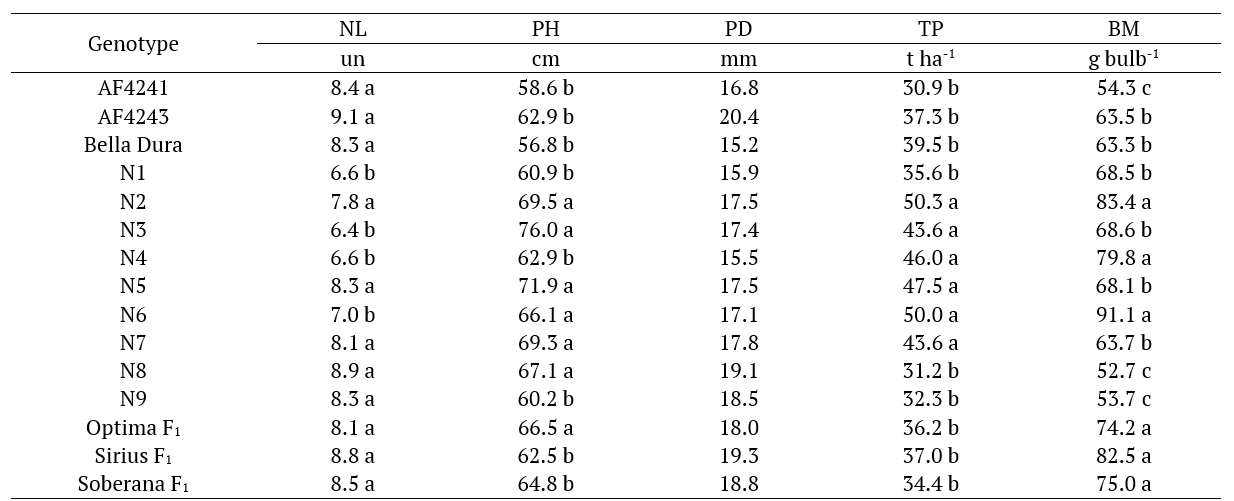 There was a significant difference between the evaluated genotypes regarding the number of leaves, plant height, total productivity and average bulb weight, except for pseudostem diameter. The largest number of leaves was found in the AF4243 genotype (9.1 leaves per plant-1), although it did not differ statistically from N8, Sirius F1, Soberana F1, AF4241, N5, N9, Bella Dura, Optima F1, N7 and N2. The genotypes N6, N4, N1 and N3 had the lowest number of leaves (<7.0 leaves per plant-1) (Table 1).