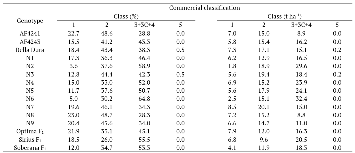 The production quality can be obtained by classifying the bulbs according to their size class (Reghin, Otto, Olinik, & Jacoby, 2006; Baier et al., 2009). Onions classified as 3+3C+4 are considered ideal for commercialization, and the experimental genotype N6, presented the highest percentage of bulbs of these classes (64.8%), followed by N2, Sirius F1, Soberana F1 and N5, with values greater than 50%. In genotypes N8, AF4241, N7, N9, N3, Bella Dura and AF4243 more than 40% bulbs belonged to class 2, however, more than 20% bulbs produced by genotypes N8, AF4241, Optima F1 and N9 belonged to class 1 (Table 2).