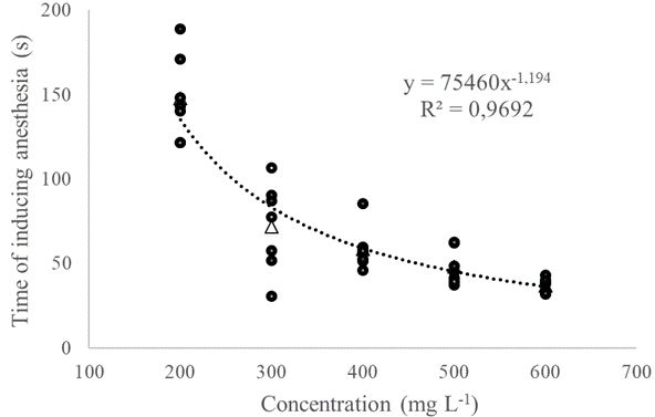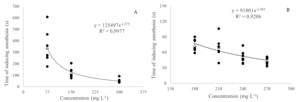 Regression curves obtained for all assays in the present study had a pattern similar to those established by other authors for eugenol (Vidal et al., 2007; Bernardes Júnior et al., 2013; Ribeiro et al., 2013) and for tricaine (Pawar et al., 2010), indicating a marked decrease in induction time between lower concentrations and a tendency toward stability as doses increase. Furthermore, the standard deviation was inversely proportional to the doses tested, of which the lowest values of standard deviation were shown with the highest dosages. Thus, higher concentrations of anesthetics are advantageous when considering a greater homogeneity and precision regarding the time for handling anesthetized fish.