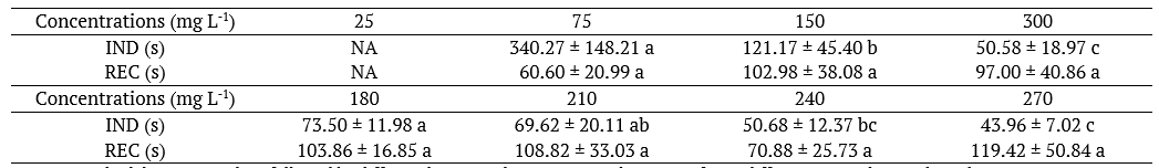 Nevertheless, the present study analyzed eugenol concentrations between 180 and 270 mg L-1 to obtain a more accurate dose with anesthetic effects in less than one minute. Induction time varied according to the concentration of eugenol, of which the highest levels (240 and 270 mg L-1) presented the shortest induction times (Table 1, Figure 1B).