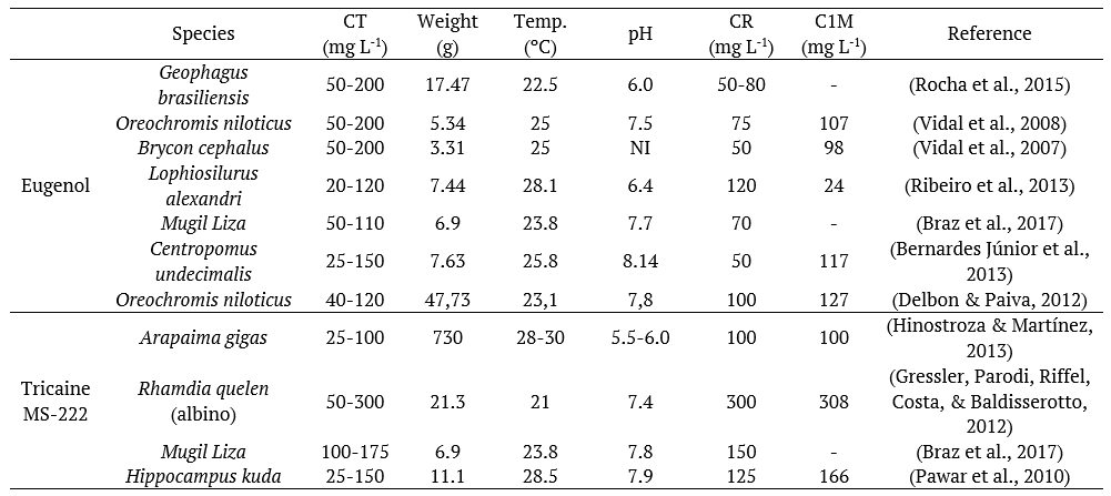 The present study recommends 217 mg L-1 of eugenol or 394 mg L-1 of tricaine for rapid anesthesia (in 1 minute) of the pearl cichlid (Geographus brasiliensis) when exposure is carried out with a water temperature and pH of 24 ± 1°C and 7.2 ± 0.2, respectively.