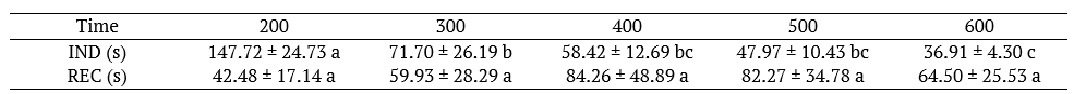 Based on the results of experiment 1, the present study sought to establish a more accurate concentration between 150 and 300 mg L-1 for an anesthetic induction time of 1 minute. The concentrations of 180, 210, 240 and 270 mg L-1 were tested. Seven fish with a mean weight of 4.59 ± 1.41 g and length of 6.53 ± 0.75 cm were used for each concentration (N = 28).