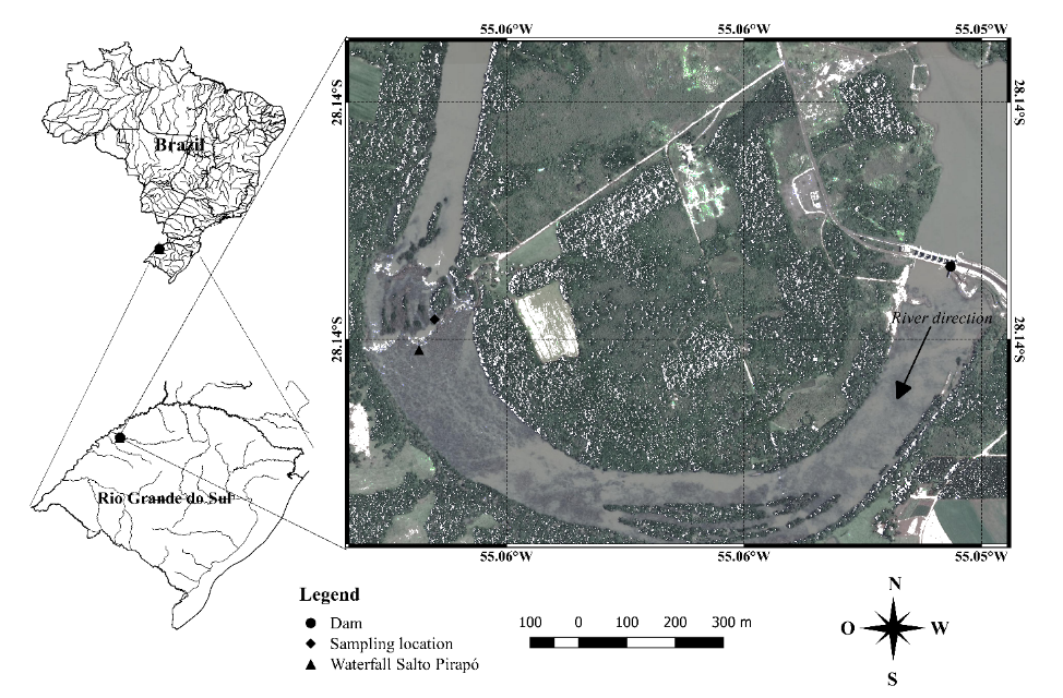 The study occurred in Salto Pirapó, located on the Ijuí River, the watershed of the Uruguay River and the border of the municipalities of Dezesseis de Novembro and Roque Gonzales, RS, Brazil (Figure 1). The section where the samples were collected is about 325 meters wide and 500 meters long and it is situated 2.2 kilometers downstream from the spillway of the Passo São João Hydroelectric Plant (HPP). It is a lotic environment, followed by water waterfalls with many rapids and small backwaters where is possible to observe several species fish jumping up the river in times of spawning.