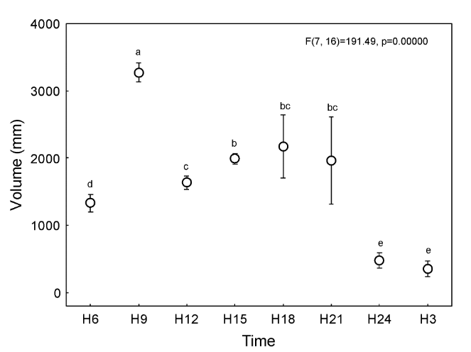 The ANOVA showed that there was a significant difference in the total volume of the items consumed by A. lacrustris throughout the day (P < 0.05). The highest consumption was verified in H9 (V = 3.280mm³, P < 0.05), and lower consumptions in H24 (V = 478mm³) and H3 (V = 361mm³) (Tukey, P < 0.05, Figure 2).