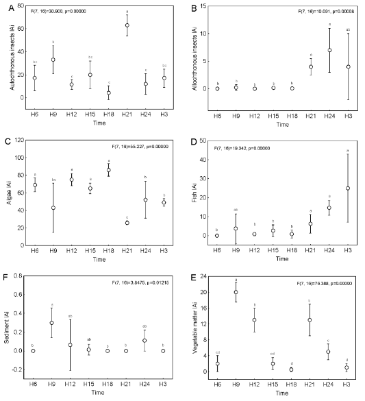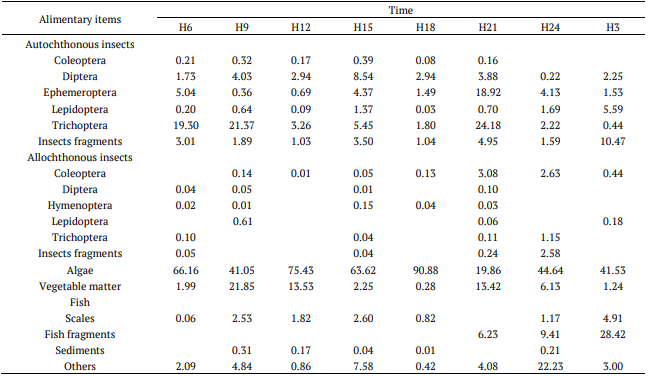 ANOVA also showed that there is significant variance in all alimentary items (P < 0.05). For the autochthonous insects, the highest values of IAi were at 9 and 21 hour (Tukey, P < 0.05, Figure 3A). For allochthonous insects, the highest values were at 21 and 24 hour (Tukey, P < 0.05, Figure 3B). For algae, the highest values were 6 hour and in the period between 12 and 18 hour (Tukey, P < 0.05, Figure 3C). For the item vegetal matter and sediments, the highest IAi values were at 9 hour, (Tukey, P < 0.05, Figures 3E and 3F).
