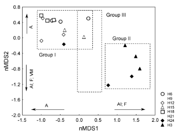 The nMDS summarized the composition of the different alimentary items present in the stomach of A. lacustris and separated the different times of the day, (Figure 4). The stability criterion was met with a final stress of 0.09 for a two-dimensional solution. The proportion of variance represented by each axis, based on the R2 between distance in the ordination space and distance in the original space, was 0.44 for the nMDS 1 and 0.25 for the nMDS 2. The result revealed three main groups: times H6+H12+H15+H18, times H24+H3 and times H9+H21, nMDS 1 was affected primarily by allochthonous insects (r=0.52), fish (r=0.85) and algae (r=-0.91), nMDS 2 was affected primarily by algae (r=0.75), allochthonous insects (r=-0.73), fish (r=-0.60) and vegetable matter (r=-0.56).
