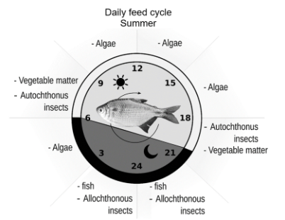 The sediment consumption was reduced and its consumption peaks coincided with the higher consumption of autochthonous insects. We theorize that this coincidence is related to the capture of the autochthonous insects that are usually found in the substrate. As a result, when consuming the insects, the sediment would be ingested simultaneously.