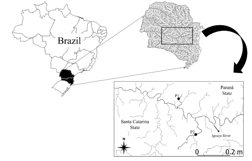 The Iguaçu River presents the biggest hydrographic basin in Paraná State, Brazil and, adding the affluents of Santa Catarina State, has a catchment area of approximately 70,800 Km² and covers an extension of 1,200 Km (Maack, 1968). This study was carried out in a region called Middle Iguaçu, in two second-order streams of the Iguaçu basin: Papuã, located in the south of Paraná State (26°07’04.1''S; 51°09'58.5''W) and Pintado, in the north of Santa Catarina State (26°20'32.4''S; 51°03'12.0''W) (Figure 1). The climate in the region is subtropical/mesothermal humid, according to the Köppen classification, with rainfall in all months of the year and average annual temperature of 17.9°C. The streams are located in a rural region and the landscape features extensive agriculture areas. There is extensive plant cover of Mixed Araucaria Forest on both banks of the streams, mainly along Papuã stream.