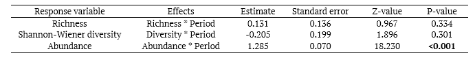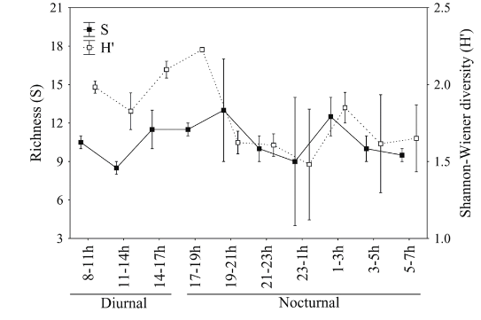 The richness (p = 0.334) and Shannon-Wiener diversity attributes (p = 0.301) were similar between diurnal and nocturnal periods (Table 3). Higher values of richness were recorded in the nocturnal period (19-21 and 1-3 hours), and Shannon-Wiener diversity in diurnal (14-17 hour) and nocturnal periods (17-19 hour) (Figure 2).