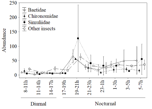 We can also infer that other factors might be responsible for the higher nocturnal drift, compared to diurnal drift in the present survey. The first one is phototaxis, and changes in light intensity can act as a trigger for active drift behavior (Naman et al., 2016; Baxter et al., 2017). Some dipterans and mayflies have negative phototaxis, which leads them to hide under pebbles during the day and drift during the night (Bishop, 1969). Second, active drift can be used to avoid adverse conditions, aiming to find a favorable site downstream in the river (Mazzucco, Van Nguyen, Kim, Chon, & Dieckmann, 2015). Finally, the nocturnal drift habit is also related to the life-cycle stage, and it is frequent in mature nymphs (Corkum & Pointing, 1979). For example, late-stage invertebrates are more prone to drift during the nocturnal period, when compared to the younger stages of development, owing to the fact that these organisms have a high risk of predation (Allan, 1982). The nocturnal peaks of drifting invertebrates might be associated with good diurnal vision in fish. However, the absence of light decreases the vision of fish, making difficult to capture prey in this period; thus, they present less predation activity during the night (Mazur & Beauchamp, 2003).