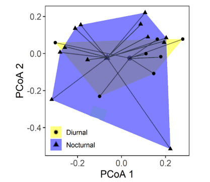 We performed the Principal Coordinate Analysis (PCoA) to visualize the (dis)similarity of the species composition of aquatic insects, between the periods (diurnal and nocturnal) (Legendre & Legendre, 1998), using a presence/absence matrix and the Jaccard index. A multivariate Permutational Variance Analysis (PERMANOVA) was performed to evaluate changes in species composition of aquatic insects between diurnal and nocturnal periods (Anderson, 2006). A total of 999 permutations were performed to assess the significance. Finally, rarefaction analysis, considering the number of individuals, was performed to compare aquatic insects’ richness during diurnal and nocturnal periods.