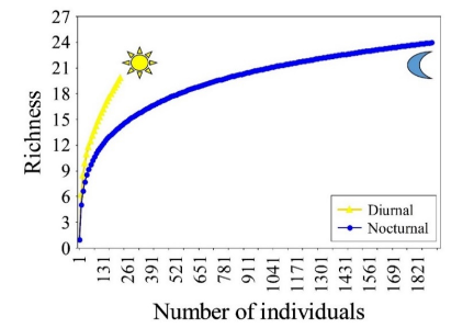 Rarefaction curves showed higher richness in the nocturnal period and a tendency to reach an asymptote. On the other hand, an increase in richness was observed in the diurnal period (Figure 5), i.e., higher richness would be found with a higher number of individuals collected.