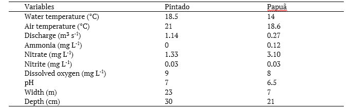The pH was neutral to slightly acid, with high oxygen concentrations in the streams, and nitrite and ammonia were also similar between the environments. Only nitrate was higher in Papuã stream (Table 1). The air and water temperatures, discharge and width were higher in Pintado stream (Table 1).