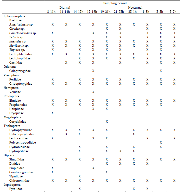 A total of 2,114 aquatic insect specimens were found, distributed in 26 families. Of these families, 20 were found during the diurnal period and 24 during the nocturnal period (Table 2). The most abundant family was Baetidae, followed by Chironomidae and Simuliidae. These families represented 72.78% of the total number of organisms. The Baetidae family was represented by seven genera and the most abundant were Americabaetis sp. and Baetodes sp.