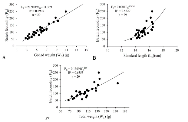The variation of batch fecundity by gonad weight shows that the larger the gonad (Figure 9A), fish length (Figure 9B), and total fish weight (Figure 9C), the larger the number of oocytes found in the batch to be spawned. On average, there were 113 oocytes per batch (minimum = 52; maximum = 249).