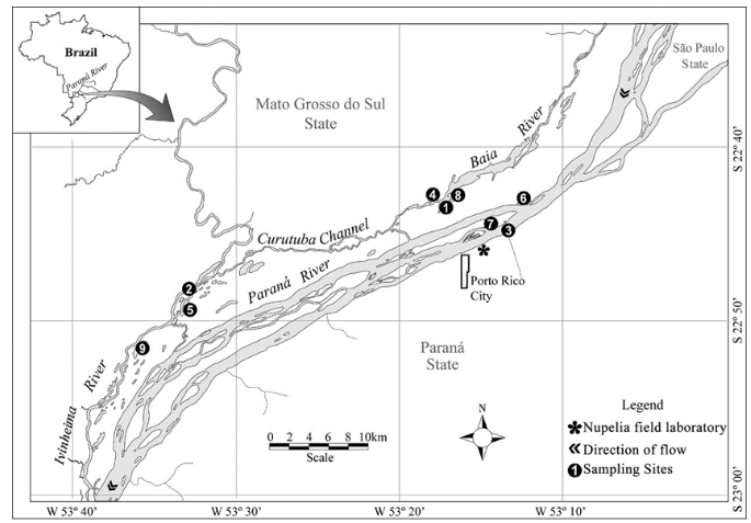 The study was carried out in the upper Paraná River floodplain. The floodplain possesses three conservation units (Parque Nacional de Ilha Grande, Área de Proteção Ambiental das Ilhas e Várzeas do rio Paraná, and the Parque Estadual do Ivinheima), characterized by being one of the few remaining lotic areas of the upper Paraná River (Agostinho & Zalewski, 1996). They are essential for the maintenance of the biological communities, which depend on the flow and hydrodynamics of the Paraná River to carry out their specific and ecological functions.