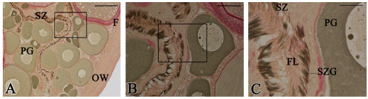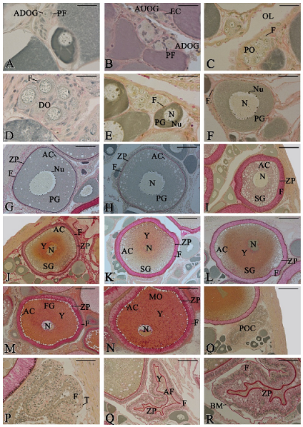A total of 470 (242 female; 228 male) gonads were histologically evaluated using light microscopy. The germ cells of the females are illustrated and described in Figure 2.